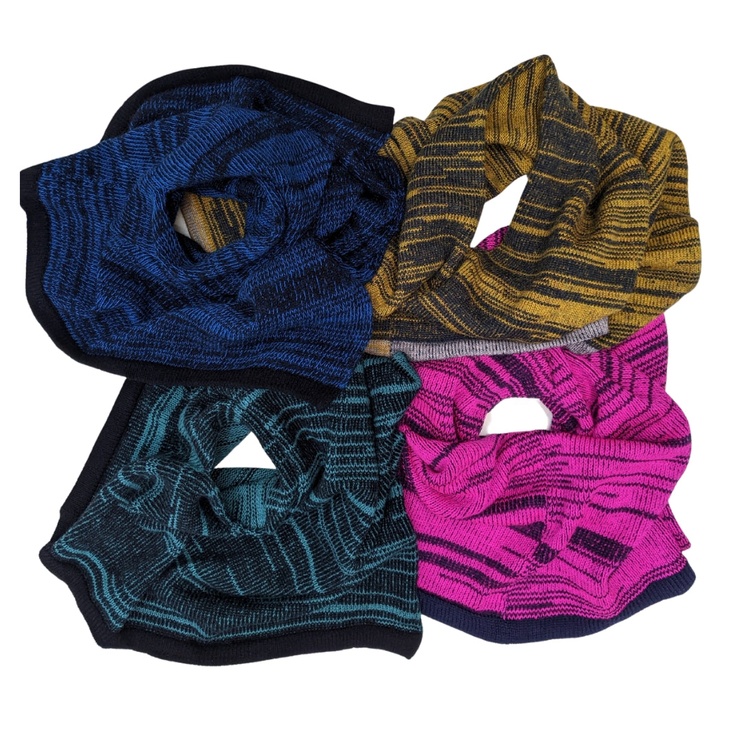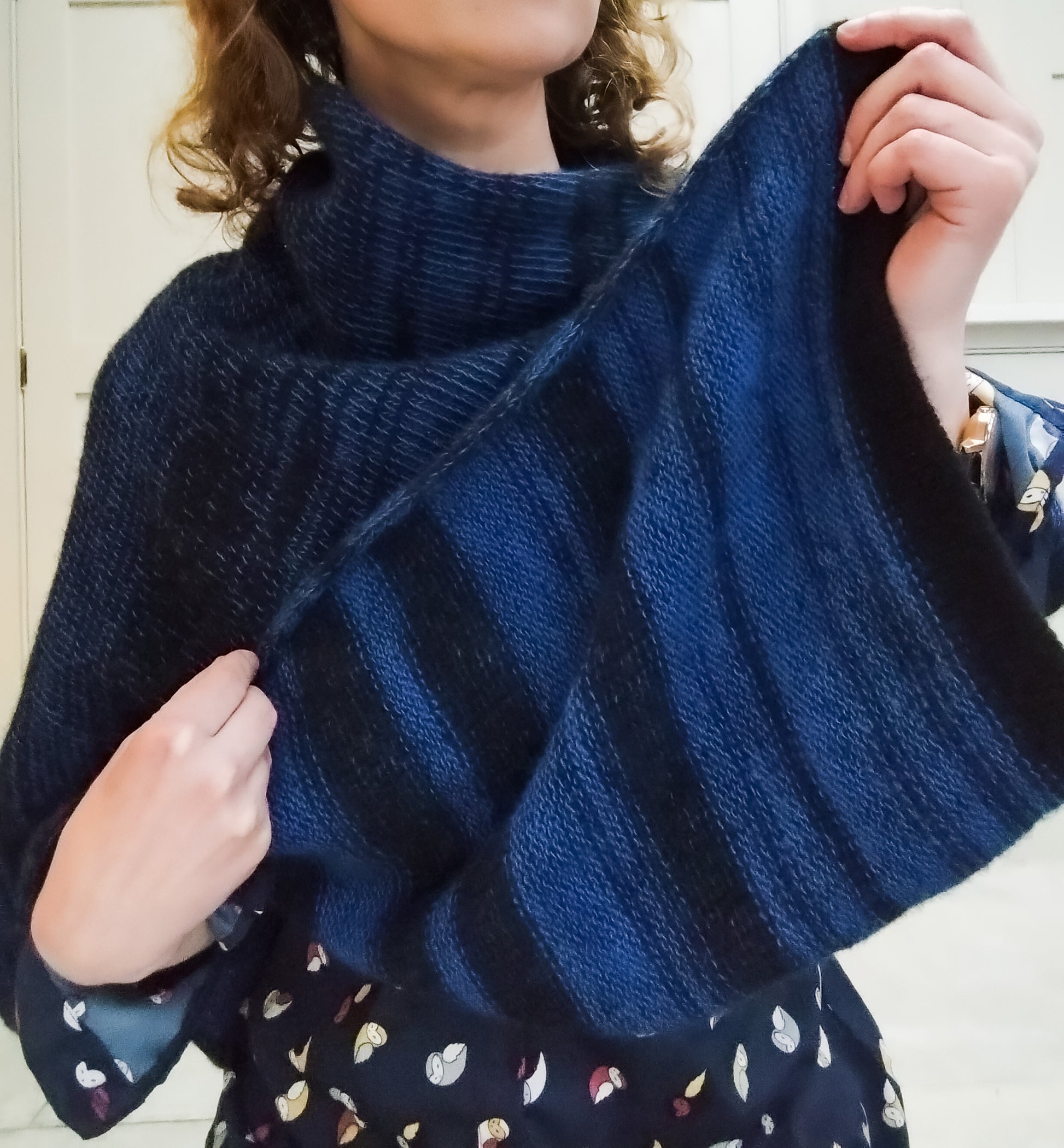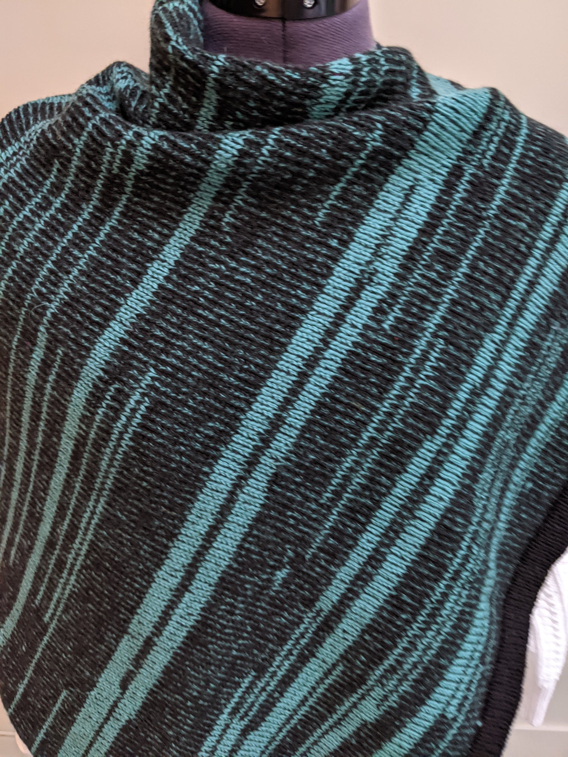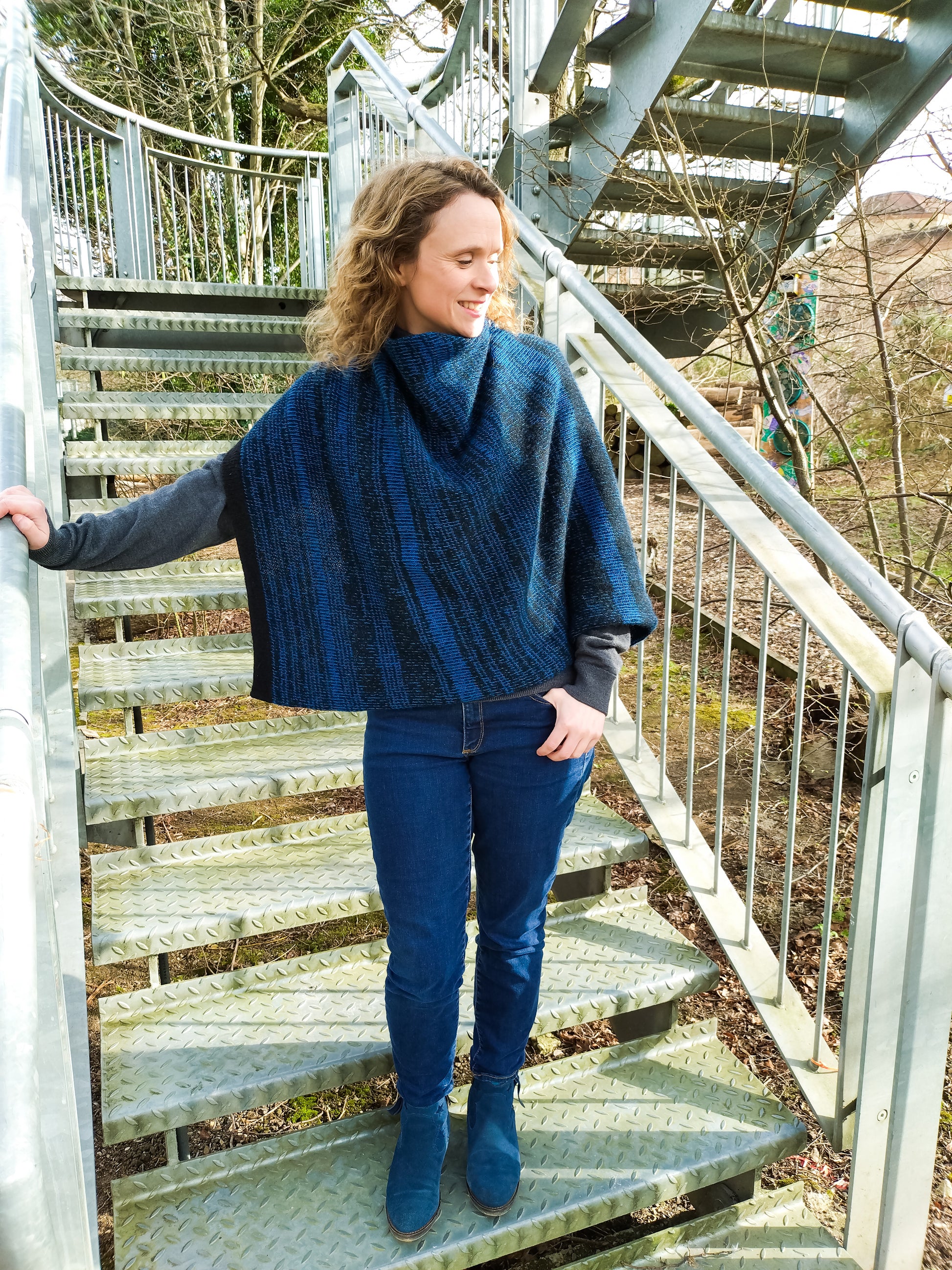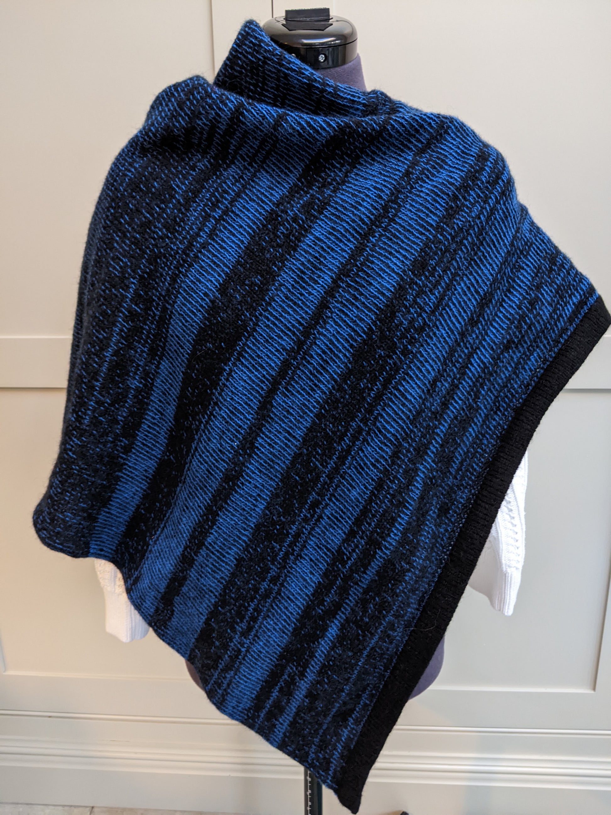 This knitted poncho has a striking jagged striped pattern, with this variegated pattern coming out differently for each poncho.