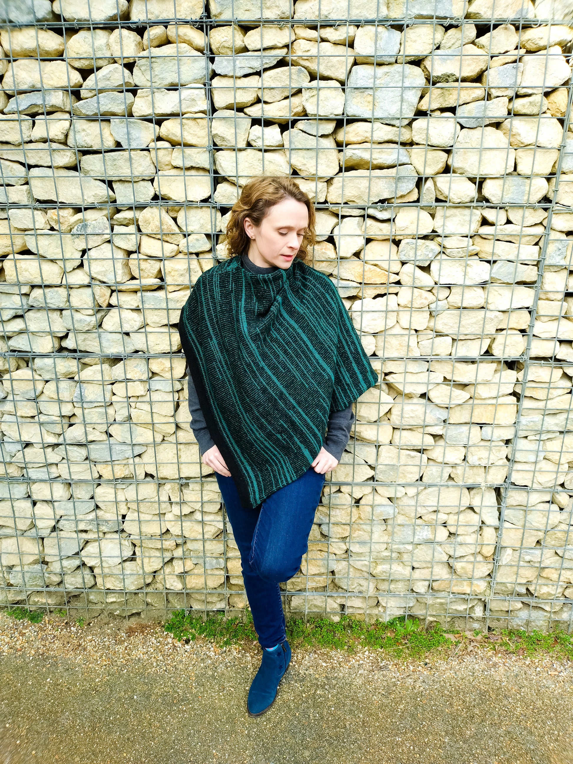 The poncho is knitted in a bright colour of your choice, and the hem and contrasting stripe colour is knitted using a black yarn.
