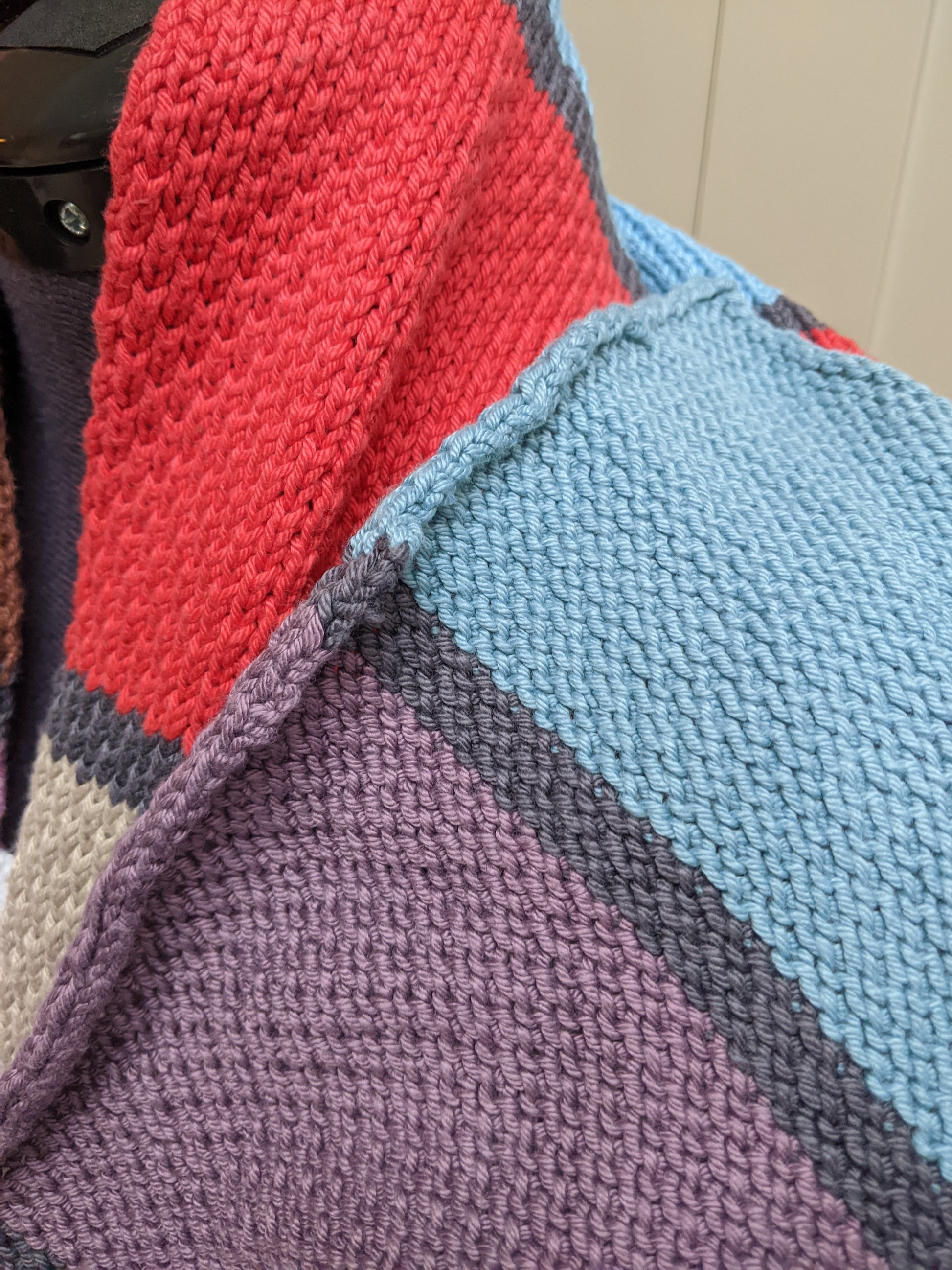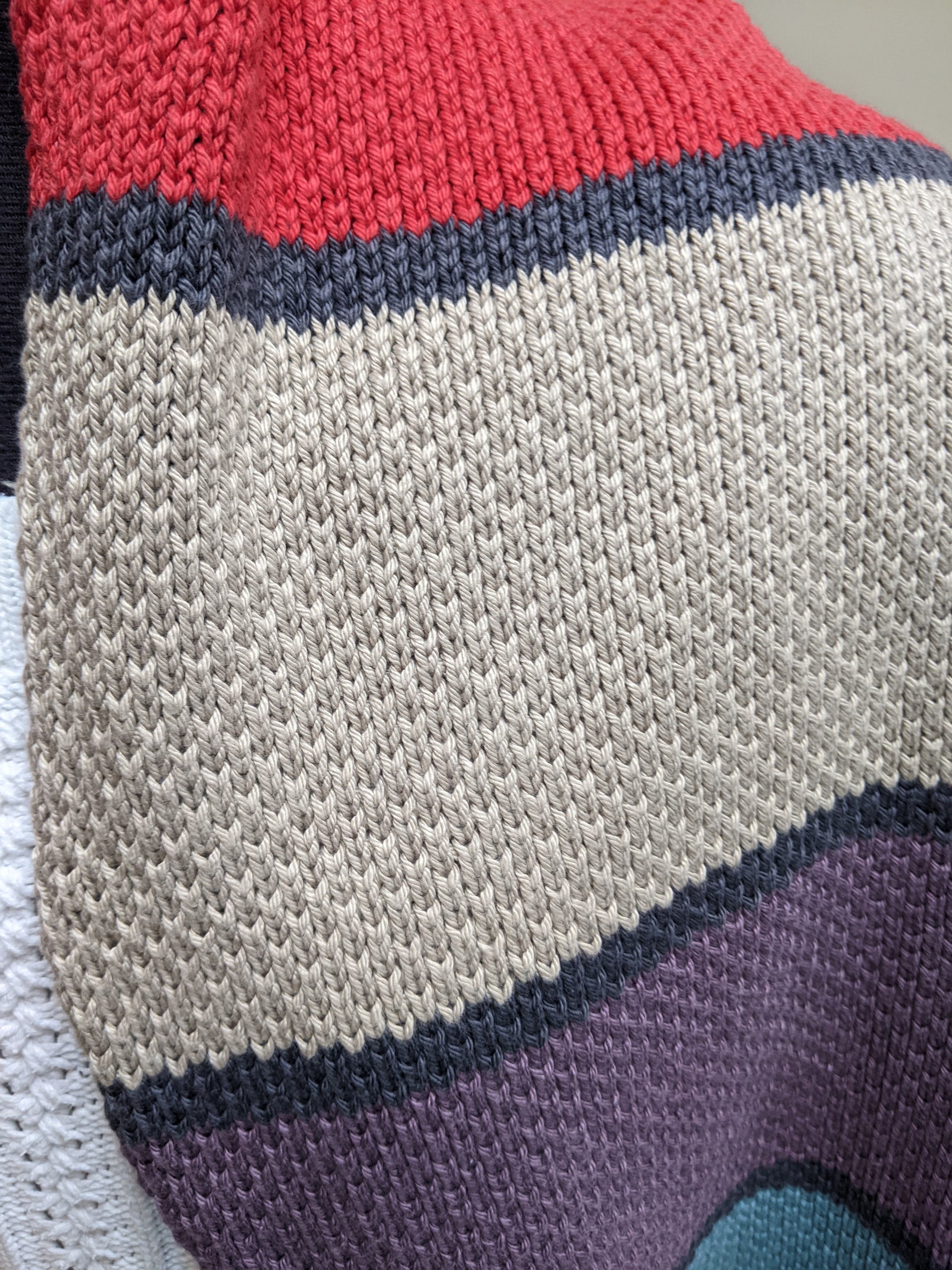 Charcoal grey yarn lends contrast to the bright stripes for a truly eye-catching effect.