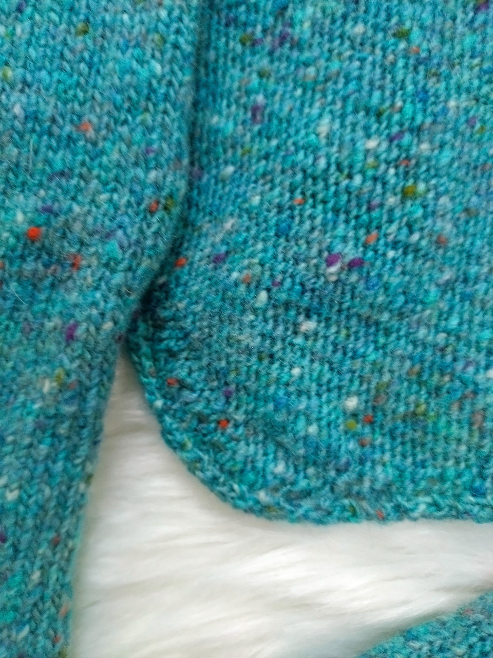 As with all my scarves, this one is handmade using my original pattern. And with deadstock yarn, once this teal-and-nep blend is gone, it’s truly gone.