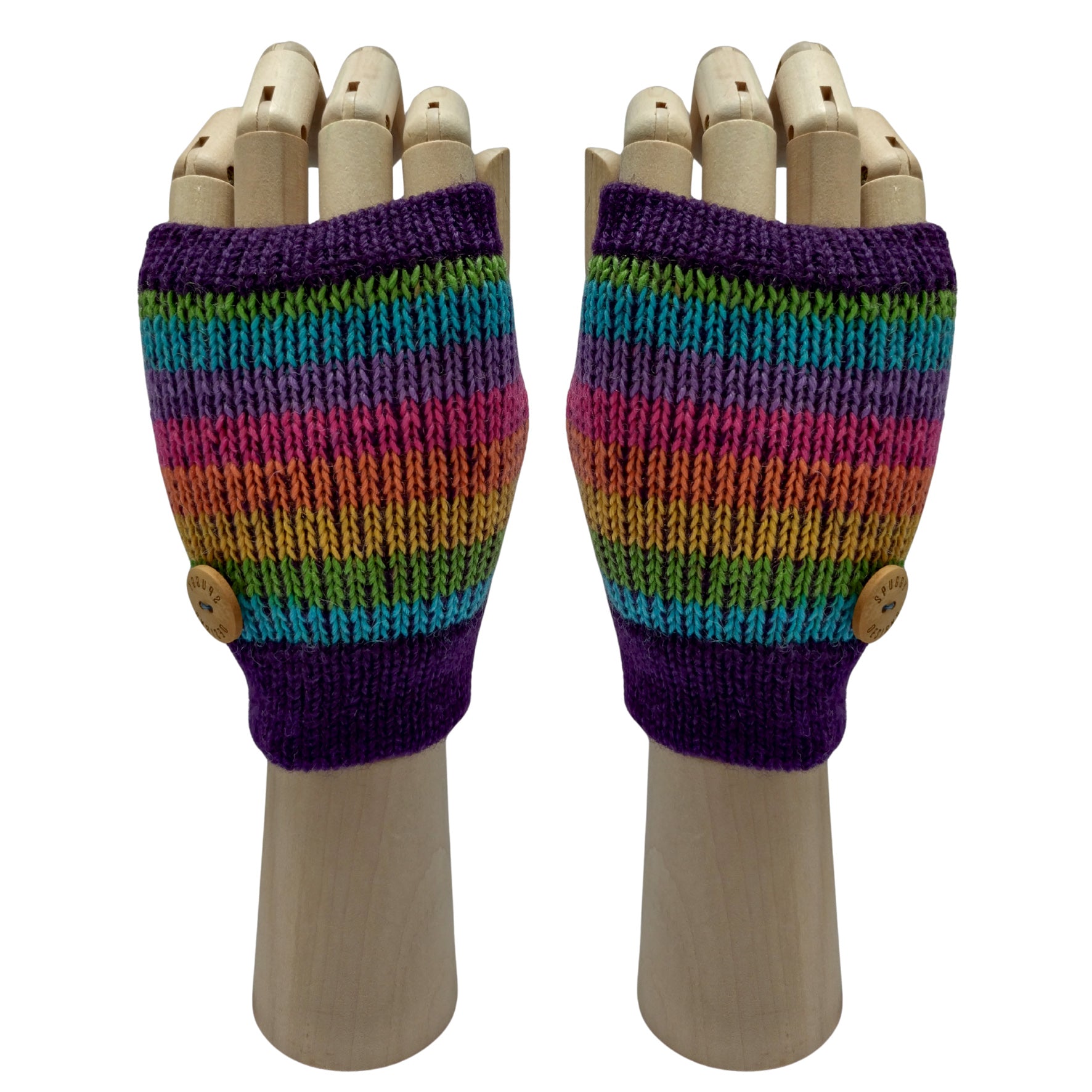 Brave the chill in style with these handcrafted Rainbow Hand Warmers. Blending bright and cheery Rainbow style wool on the outside with soft, cosy Plum Purple merino cuff and lining on the inside, these versatile warmers keep your hands toasty while allowing full dexterity.